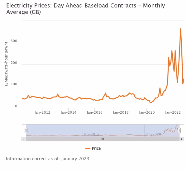 But as the war in Ukraine broke out and spread, the price of Natural gas tripled, as we can see from the chart above. With increased volatility and price surge in natural gas, the cost of electricity rose from around £90 / MWh to nearly £360 / MWh in 2022.
